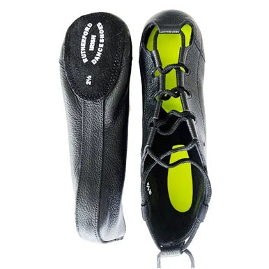 Rutherfords are proud to introduce their new style of Reel Pump into the market: The RUTHERFORD CAVAN GOLD PUMP. This shoe has been years in the making. Its Black Suede Split Sole offers superior flexibility. The thick poron cushion insole provides unmatched shock resistance and an ultimate comfort level. This shoe has tremendous arch and toe point construction. The Rutherford Cavan Pump has a short toe and leaves lots of white sock showing. It comes complete with popular round laces for pulling up and tightening with ease. It is made of the Finest quality soft stretchable leather which requires a very tight fit.