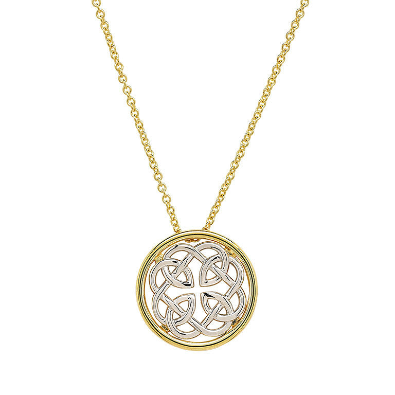 The 14kt Gold Vermeil Celtic Necklace is an exquisite piece of Irish jewelry that embodies the rich heritage and timeless beauty of Celtic design, making it a meaningful gift, cherished keepsake or elegant reminder of Irish culture. This stunning necklace features a captivating sterling silver Celtic knot, a symbol of eternity and interconnectedness, beautifully contrasted against the warm glow of 14kt gold vermeil. The necklace is crafted with an 18" cable chain and a 2" extension, providing versatile styling options and a perfect fit, secured with a reliable lobster catch. The combination of luxurious gold vermeil and intricate sterling silver detail makes this necklace a standout piece in any collection, appealing to those seeking authentic Irish elegance and symbolism.