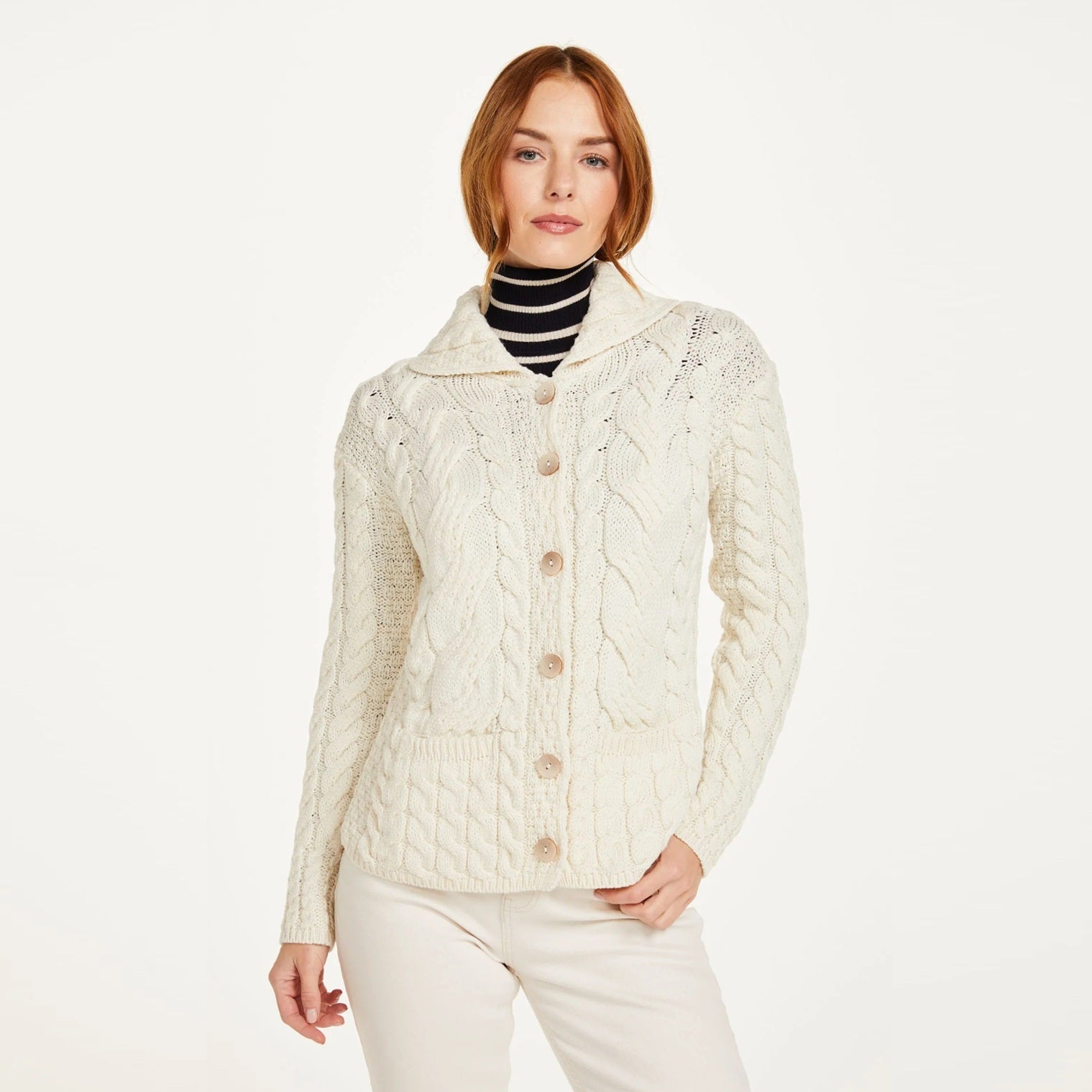 Celebrating the historically loved beauty of Aran stitching while welcoming the magic of a modern cut, this Aran cardigan is a magnificent nod to Aran tradition, yet captures a contemporary flare that Aran knitwear hasn’t quite seen before. We absolutely adore the modern take on traditional stitching, to include chunky four finger and rope cables and a beautiful moss stitch button stand. Crafted with Supersoft Merino wool, with practical and perfectly crafted pockets, you’ll feel comfortable, cosy and confident in this knit. The old and the new, balanced to perfection.