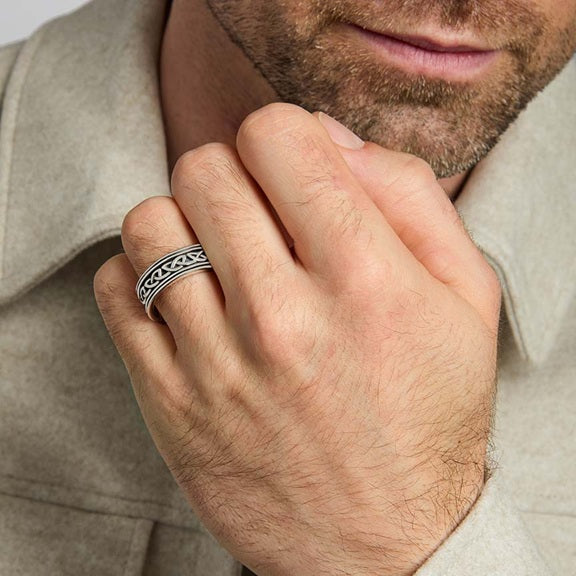 This men's oxidised silver Celtic Knot ring features a contemporary take on timeless Celtic knotwork. The oxidised finish gives this silver band a darker vintage look. While the colour of the oxidised part of the ring may vary slightly, this is totally normal. This Celtic Knot band has been hallmarked by the Irish Assay Office in Dublin Castle to guarantee its exceptional quality.