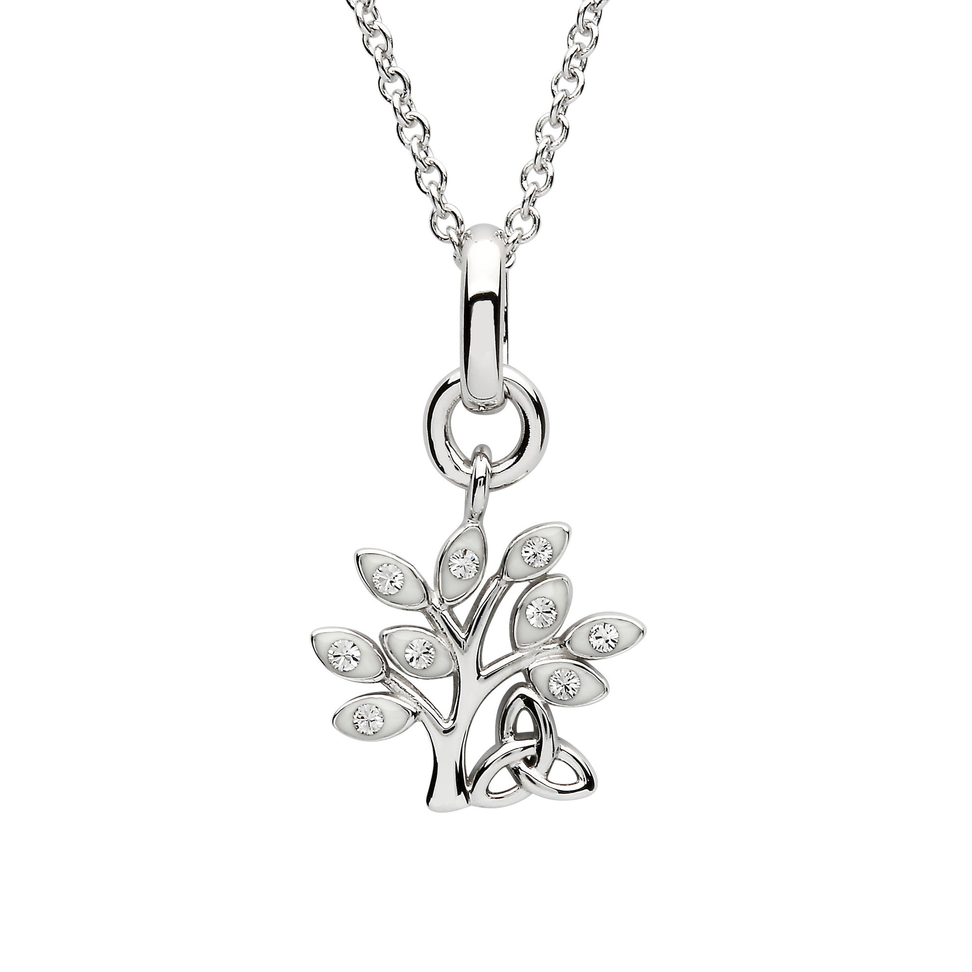 Crafted in sterling silver and embellished with sparkling crystals this gorgeous accessory is on a thin silver chain. The pendant is a bejeweled tree of life the ancient Irish symbol for positive energy and happy and new beginnings. The foliage of the tree of life motif is studded with dainty crystals. A tiny trinity knot is also nestled here toward the base signifying love faith and hope. This elegant necklace is a timeless addition to any collection.