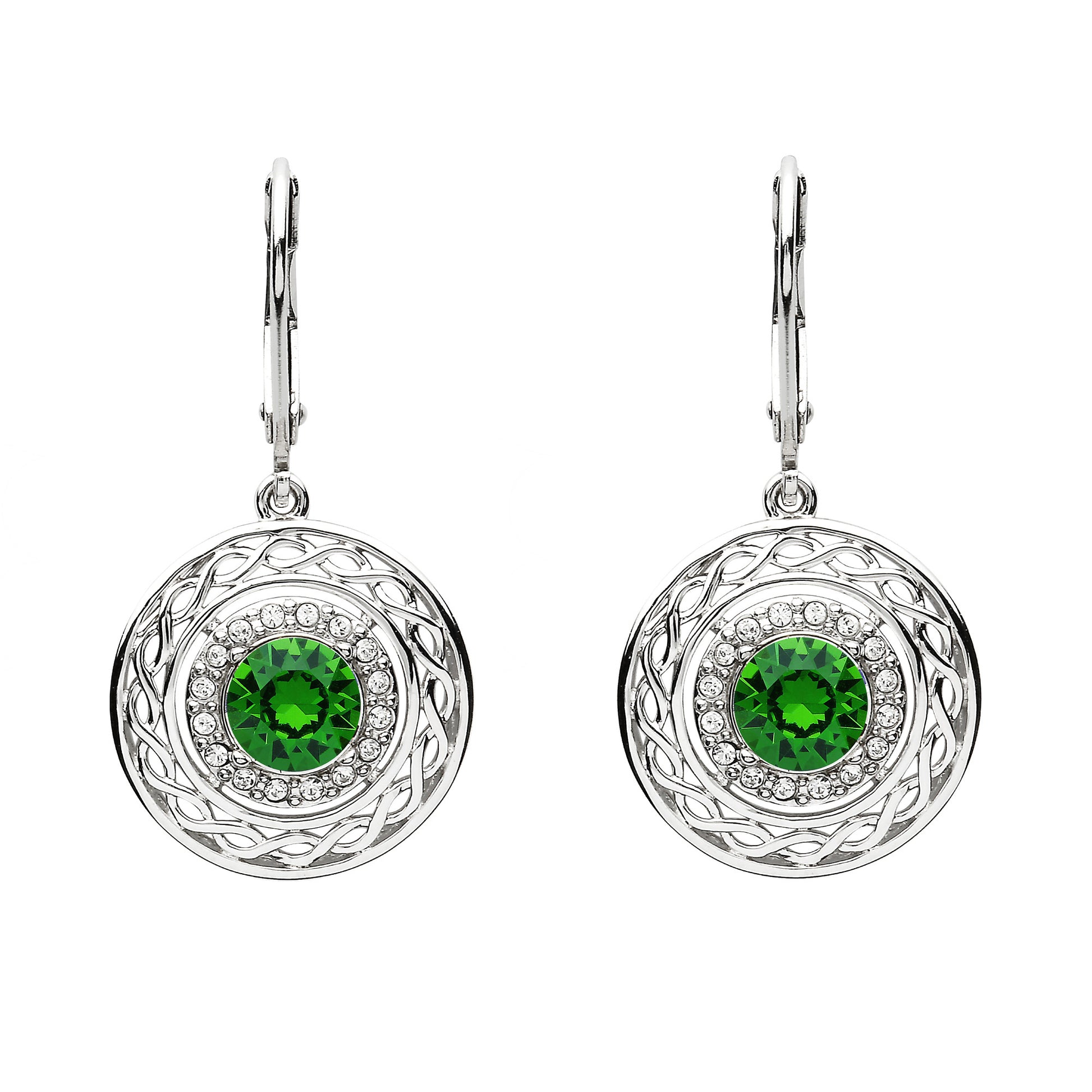 The Sterling Silver Celtic Halo Earrings with White Crystals feature round pendants meticulously crafted from high-quality Sterling Silver, adorned with 32 sparkling stones. Each earring boasts a flawless Emerald green crystal at its center, encircled by a radiant halo of smaller white crystals. Expertly crafted, these earrings exude elegance and charm, making them a striking accessory for any occasion, adding a touch of sophistication and allure to any ensemble.